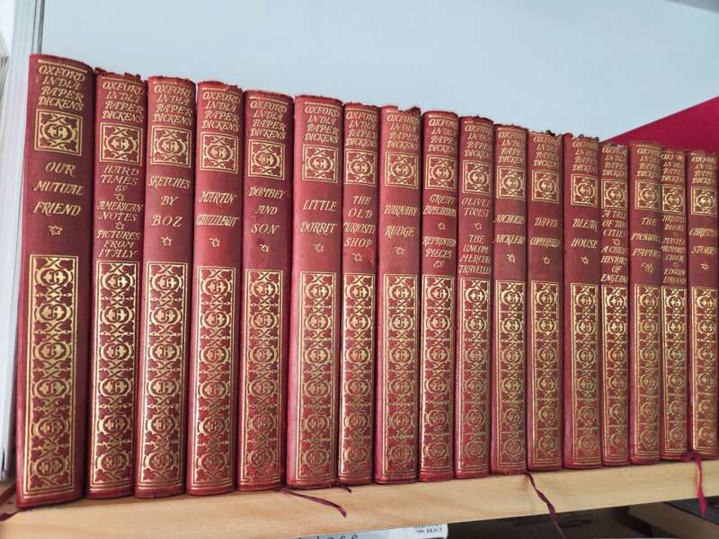 London & New York: Chapman & Hall, Limited and Humphrey Milford, Oxford University Press, [No date, circa 1920]. 12mo. 17 volumes, set. Original limp red leather, gilt. Top edges gilt. Marbled end papers. Silk marker ribbons. With illustrations by Cruikshank, 'Phiz', etc. Spine uniformly faded. . Contents clean. Near fine.